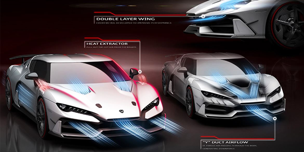 車前方的設計靈感源于性能最強悍的車型:單座賽車。車前鼻的造型特征六邊形,來源于2016年推出的概念車GTZero,并將在未來延續(xù)使用。這一構造與側方的兩個進氣口共同工作,保證最佳的進氣性能。空氣從中央進氣口進入,經(jīng)過“Y形”通道,從車蓋上方的兩個開口出來,由此產(chǎn)生下壓力。后擾流板的下方翼片使這一空氣動力氣流下壓力最大化。
